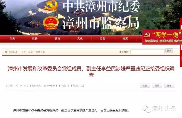 漳州頭條從中共漳州市紀委、漳州市監(jiān)察局網(wǎng)站獲悉,州市紀委今天早上剛剛權威發(fā)布,漳州市發(fā)展和改革委員會黨組成員、副主任李益民涉嫌嚴重違紀,目前正接受組織調查。