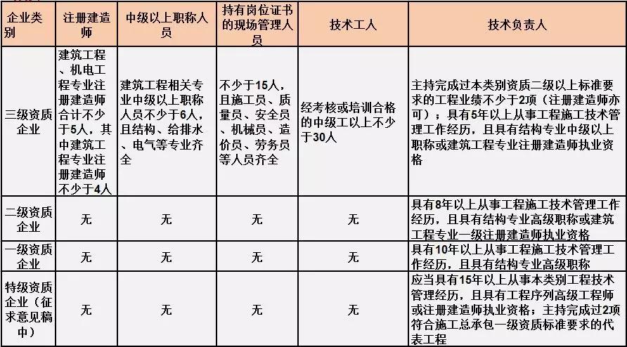 換句話說,并不是所有企業(yè)資質(zhì)都不要求有建造師等企業(yè)人員。施工總承包三級資質(zhì)企業(yè)對建造師等人員仍有要求,一級資質(zhì)、二級資質(zhì)企業(yè)保留技術(shù)負(fù)責(zé)人這一項(xiàng)要求,特級資質(zhì)另有規(guī)定。