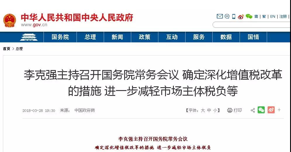 2018年3月28日國務(wù)院常務(wù)會議決定,將制造業(yè)等行業(yè)增值稅稅率從17%降至16%,將交通運(yùn)輸、建筑、基礎(chǔ)電信服務(wù)等行業(yè)及農(nóng)產(chǎn)品等貨物的增值稅稅率從11%降至10%,預(yù)計(jì)全年可減稅2400億元。